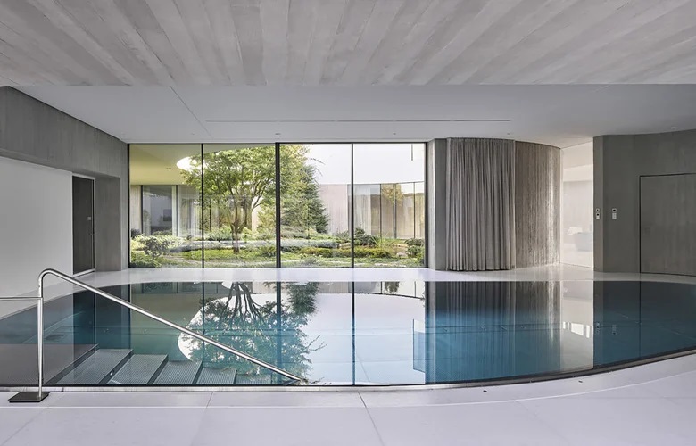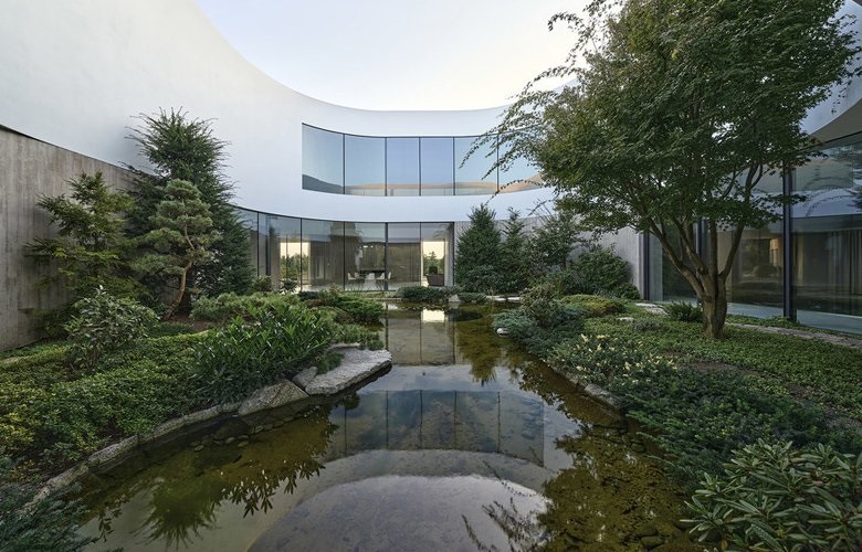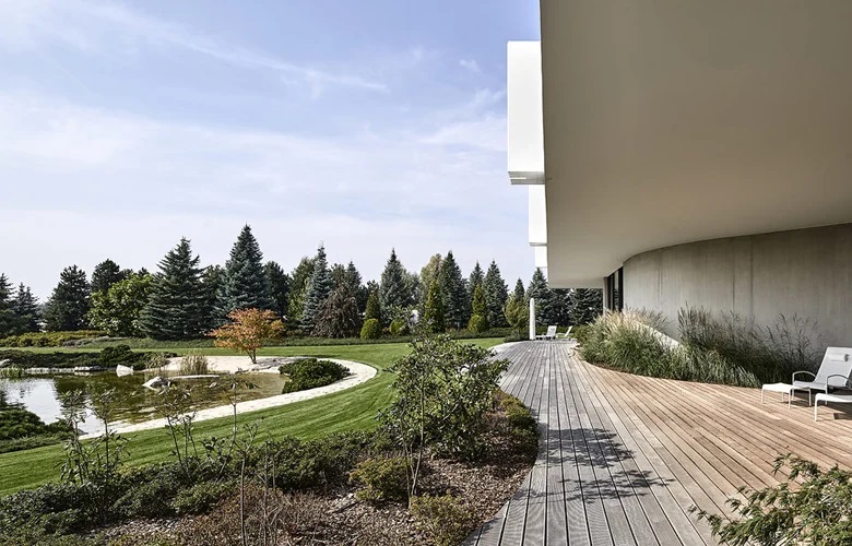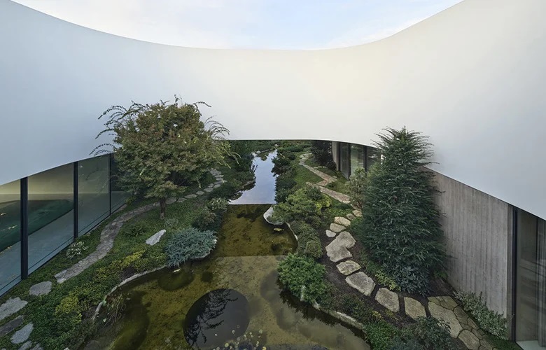 Η μινιμαλιστική αισθητική έρχεται σε εσκεμμένη αντίθεση με την πλούσια βλάστηση και το άφθονο πράσινο του κήπου, δημιουργώντας ένα αρμονικό όλον.