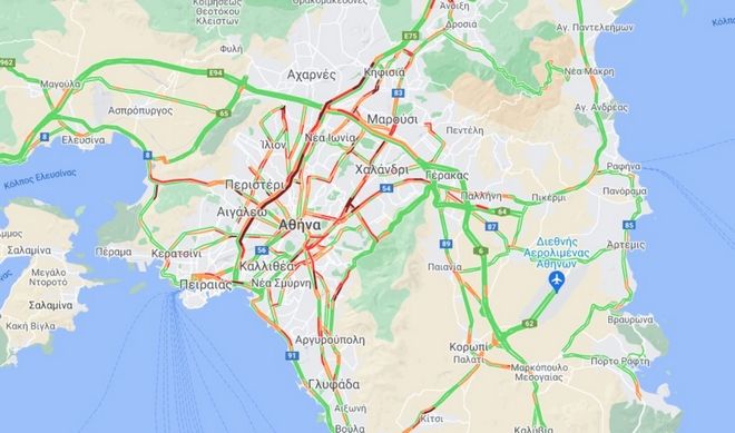 Πυκνή ροή των οχημάτων παρατηρείται σε άνοδο Συγγρο, Καλλιρόης, Βασ. Κωνσταντίνου, Κηφισίας, Μεσογείων, Πειραιώς, Αχιλλέως, Αλεξάνδρας και στους δρόμους προς το λιμάνι του Πειραιά.