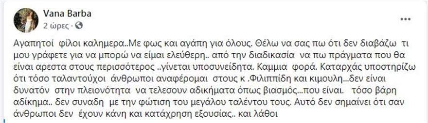 Επιμένει στην υπεράσπιση του Πέτρου Φιλιππίδη η Βάνα Μπάρμπα, παρά το γεγονός ότι τον ηθοποιό αυτή τη στιγμή βαραίνουν κατηγορίες για έναν βιασμό και δύο απόπειρες βιασμού.