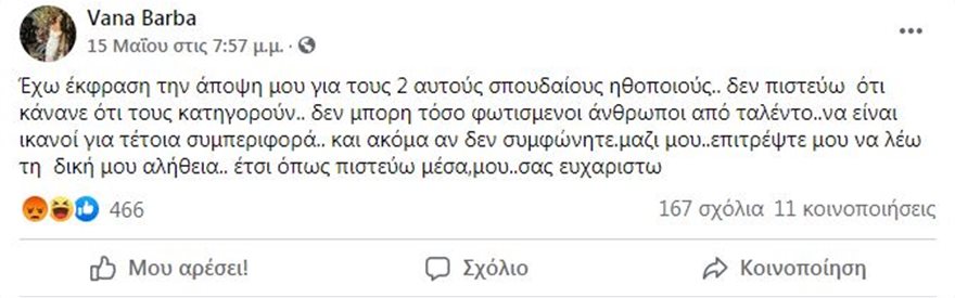 «Δύο τόσο ταλαντούχοι άνθρωποι δεν είναι δυνατόν να τελέσουν αδικήματα, όπως ο βιασμός» έγραψε η ηθοποιός, «ξεχνώντας» ίσως ότι ο Γιώργος Κιμούλης δεν αντιμετωπίζει κατηγορίες για σεξουαλικά εγκλήματα.