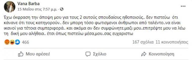 Η ηθοποιός ξεκίνησε τη δική της γραμμή υπεράσπισης, όταν στις 15 Μαΐου έγραψε στον προσωπικό της λογαριασμό στο Facebook: «Κάτω τα χέρια από τον Φιλιππίδη.. αρκετά πια..».