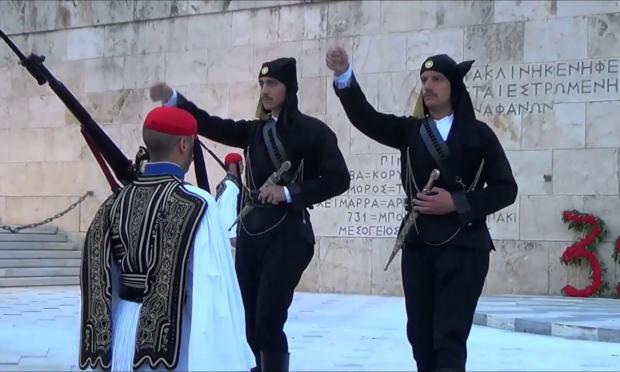 Το πρώτο άγημα των δύο Ευζώνων θα βρίσκεται στο Μνημείο του Αγνώστου Στρατιώτη στις 6:00 μ.μ. ενώ η δεύτερη αλλαγή θα πραγματοποιηθεί στις 7:00 μ.μ. και θα διαρκέσει μέχρι τις 8:00 μ.μ. Με το τέλος και της δεύτερης αλλαγής και όσο αρχίζει να σκοτεινιάζει θα ξεκινήσει ο συμβολικός φωτισμός του κτιρίου της Βουλή.
