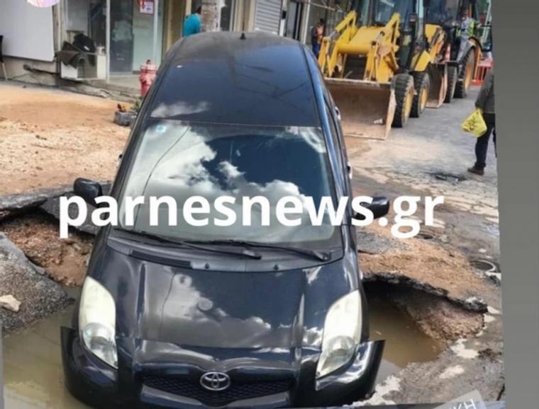 Μία πρωτοφανή εικόνα αντίκρισαν διερχόμενοι οδηγοί στην Λ. Πάρνηθος στο ύψος της Αριστοτέλους στις Αχαρνές με ΙΧ να το έχει κυριολεκτικά καταπιεί η γη! Το περιστατικό συνέβη σε παρκαρισμένο όχημα το οποίο βυθίστηκε σε σημείο στο οποίο η ΕΥΔΑΠ πραγματοποιούσε εργασίες αποκατάστασης βλάβης του δικτύου.