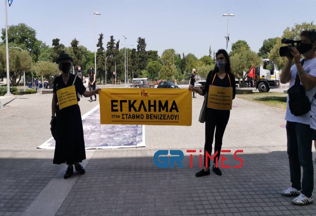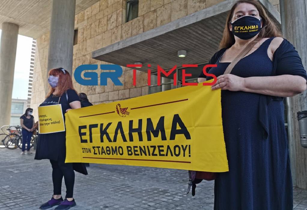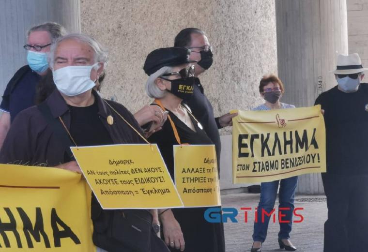 Στην κινητοποίηση μπροστά από το δημαρχείο στη Θεσσαλονίκη παίρνουν μέρος μέλη της Κίνησης Πολιτών για την προστασία της πολιτιστικής κληρονομιάς.