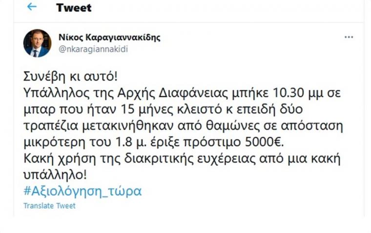 Το θέμα ανέδειξε με ανάρτησή του στο twitter ο δικηγόρος Νίκος Καραγιαννακίδης ο οποίος έγραψε: «Συνέβη κι αυτό! Υπάλληλος της Αρχής Διαφάνειας μπήκε 10.30 μμ σε μπαρ που ήταν 15 μήνες κλειστό κ επειδή δύο τραπέζια μετακινήθηκαν από θαμώνες σε απόσταση μικρότερη του 1.8 μ. έριξε πρόστιμο 5000€. Κακή χρήση της διακριτικής ευχέρειας από μια κακή υπάλληλο!»
