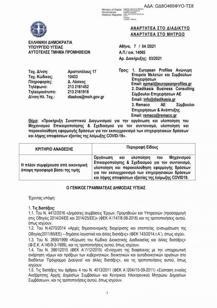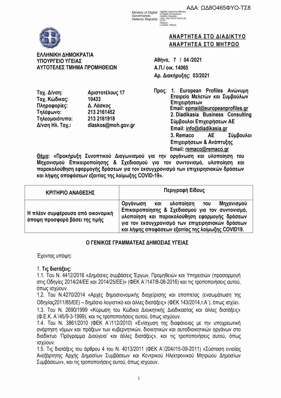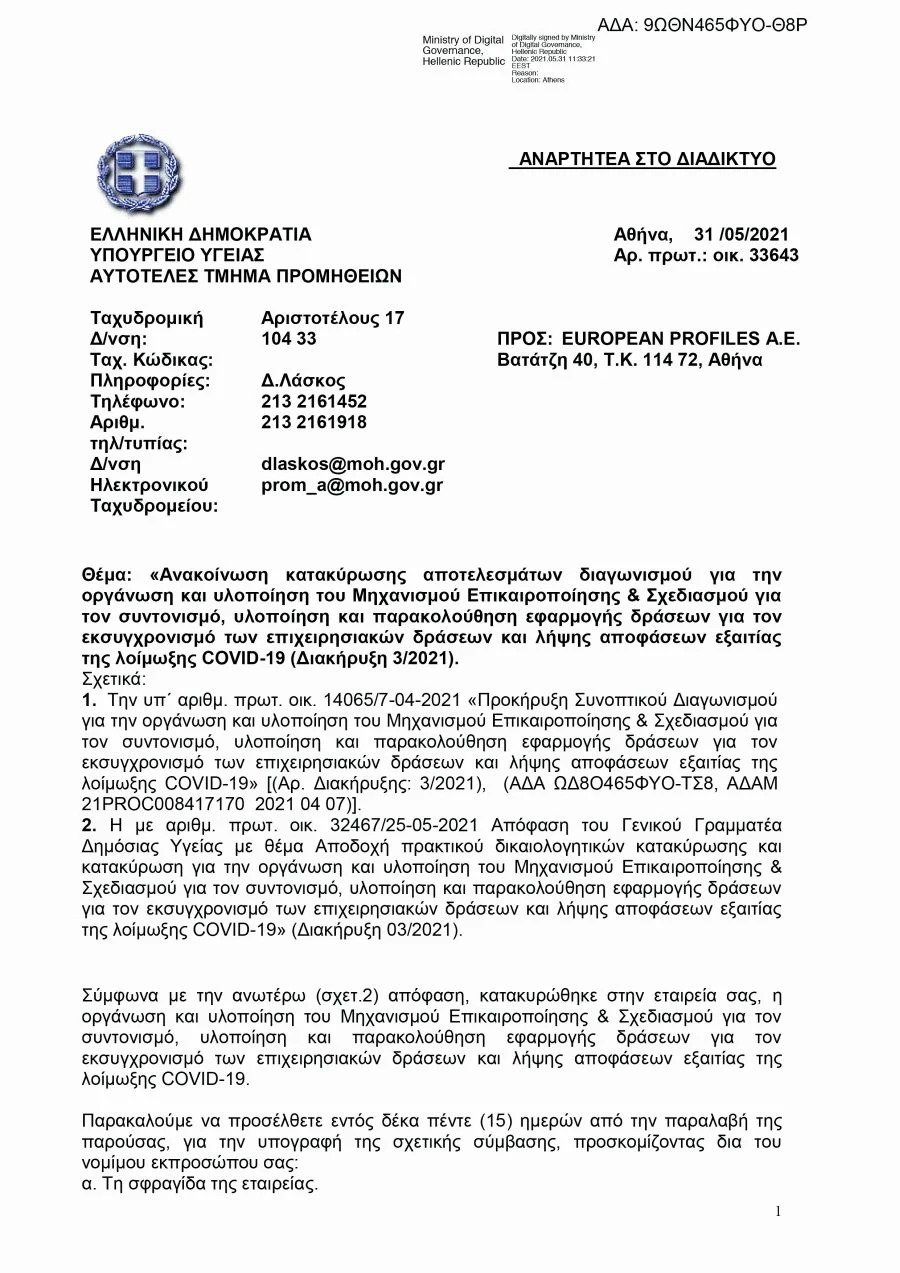 Αντίθετα, ο νέος διαγωνισμός, ύψους σχεδόν 60.000 ευρώ, αφορά την υλοποίηση και οργάνωση του μηχανισμού επικαιροποίησης και σχεδιασμού για την εφαρμογή εκσυγχρονισμένων δράσεων και τη λήψη αποφάσεων σχετικά με τον κορωνοϊό. Το παραπάνω έργο, για το οποίο κατέθεσαν προσφορά συνολικά τρεις εταιρίες, θα αναλάβει τελικά η European Profiles A.E. και το χρονοδιάγραμμα υλοποίησής του ορίζεται σε τρεις μήνες από την υπογραφή της σύμβασης.