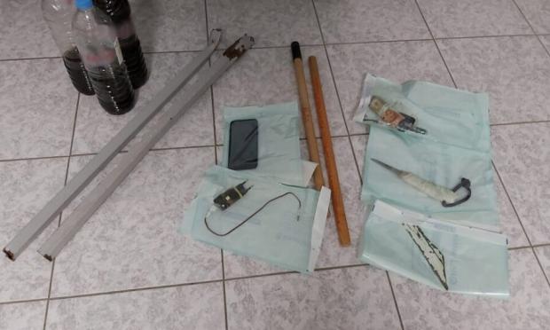 Ειδικότερα και όπως έγινε γνωστό, κατά τη διάρκεια της έρευνας συνολικά βρέθηκαν και κατασχέθηκαν: 14 αυτοσχέδια μαχαίρια, 5 αυτοσχέδιες μεταλλικές ράβδοι, 2 κινητά τηλέφωνα, φορτιστής κινητού τηλεφώνου, 3 μπουκάλια κρασί, 23 δισκία διαφόρων χρωμάτων, αγνώστων ουσιών και 50 ευρώ.