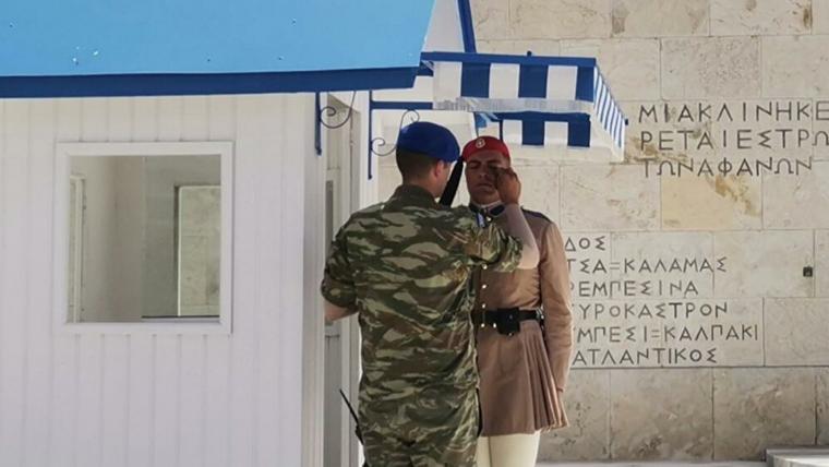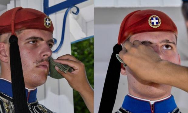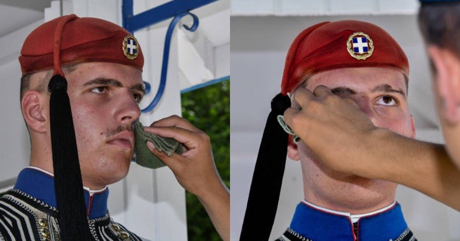 Οι Εύζωνες φρουρούν, ακίνητοι, κάτω από αυτές τις υψηλές θερμοκρασίες, το μνημείο του Αγνώστου Στρατιώτη ενώ η αλλαγή φρουράς γίνεται κάθε μία ώρα. Κάθε ένα τέταρτο, ο επόπτης σκοπιάς τους σκουπίζει από τον ιδρώτα χρησιμοποιώντας το φάριο και ειδικά πανάκια, ενώ κάθε μισή ώρα τους δίνεται νερό. Στη συνέχεια, είναι σημαντικό να αναφερθεί ότι από τις 12 το μεσημέρι μέχρι τις 6 το απόγευμα δεν κάνουν το ημίωρο και λόγω ζέστης, κάνουν ακινησία. Αρκετοί τουρίστες, παρά τον καύσωνα, είναι μαζεμένοι, στο σημείο, προκειμένου να τους φωτογραφίσουν και να βγάλουν μια selfie.