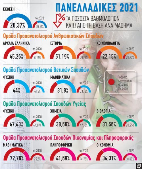 Τέλος, σχετικά με τους υποψήφιους της Ομάδας Προσανατολισμού Σπουδών Οικονομίας και Πληροφορικής, στα Μαθηματικά το 72,76% (75,6% πέρυσι) έγραψε κάτω από τη βάση. Τα γραπτά που βαθμολογήθηκαν με βαθμό άνω του 18, ήταν πολύ λίγα, ήτοι 2,66% (1,73% το 2020). Στο μάθημα της Πληροφορικής, κάτω του 10 έγραψε το 41,69% (44,75% το 2020) των υποψηφίων. Δεν έλειψαν ωστόσο και οι καλές βαθμολογίες, με το 21,70%% των υποψηφίων να παίρνει βαθμό από 18 έως 20. Στο μάθημα της Οικονομίας, κάτω από τη βάση έγραψε το 34,31% των υποψηφίων (31,60% το 2020) και 18-20 το 27,12%.