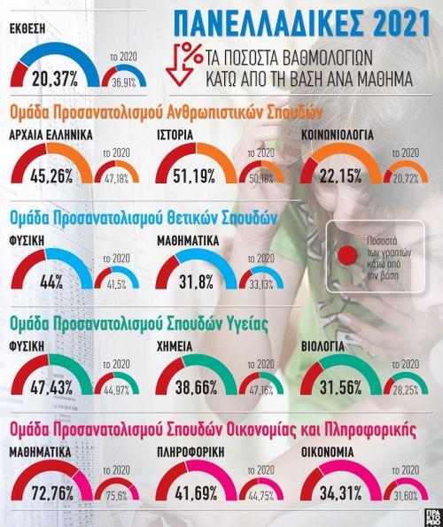 Μεγάλα ποσοστά βαθμολογιών κάτω από τη βάση -με εξαίρεση τη Χημεία, όπου υπήρξε βελτίωση κατά 8,5% στο ποσοστό αυτό- διασπορά των βαθμολογιών άνω του δέκα και μικρές αυξομειώσεις στον αριθμό των υποψηφίων που αρίστευσαν συγκριτικά με πέρσι. Αυτά είναι τα στοιχεία που συνθέτουν τη γενική εικόνα των φετινών βαθμολογιών των υποψηφίων των ημερήσιων ΓΕΛ στις Πανελλαδικές Εξετάσεις.