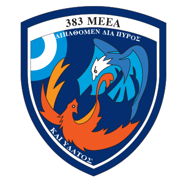 Το έμβλημα της 383 ΜΕΕΑ συμβολίζει την αέναη μάχη μεταξύ του καλού και του κακού, με τον μπλε αετό (το νερό) να επικρατεί του κόκκινου δράκου (της καταστροφικής φωτιάς), ενώ στην όλη σύνθεση περιλαμβάνεται το εθνόσημο με τους ομόκεντρους κύκλους.