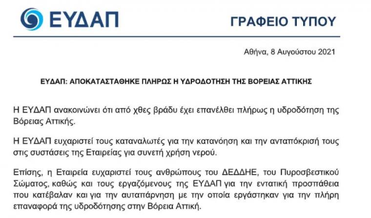 Η ίδια ανακοίνωση ανέφερε: «Η ΕΥΔΑΠ ευχαριστεί τους καταναλωτές για την κατανόηση και την ανταπόκρισή τους στις συστάσεις της Εταιρείας για συνετή χρήση νερού. Επίσης, η Εταιρεία ευχαριστεί τους ανθρώπους του ΔΕΔΔΗΕ, του Πυροσβεστικού Σώματος, καθώς και τους εργαζόμενους της ΕΥΔΑΠ για την εντατική προσπάθεια που κατέβαλαν και για την αυταπάρνηση με την οποία εργάστηκαν για την πλήρη επαναφορά της υδροδότησης στην Βόρεια Αττική».