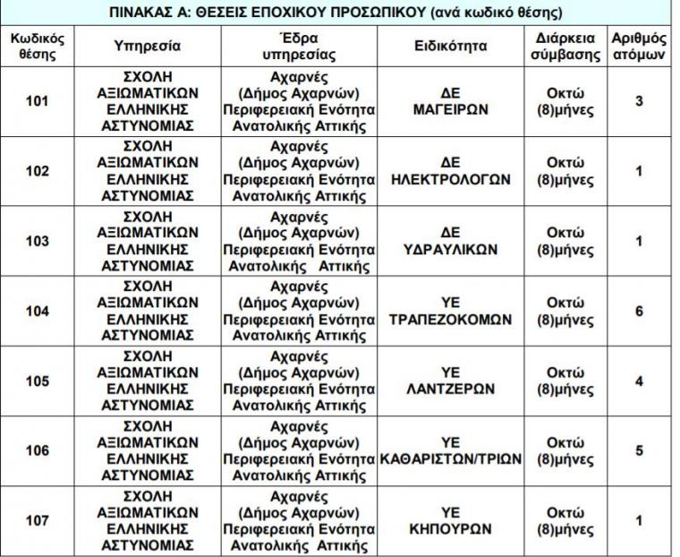 Η Σχολή Αξιωματικών Ελληνικής Αστυνομίας που εδρεύει στο Δήμο Αχαρνών Αττικής, με την υπ’ αριθμό 12758/2021//1/2021 από 26/07/2021 έγκριση ανακοίνωσης του ΑΣΕΠ, ανακοινώνει ότι θα προσλάβει προσωπικό με σύμβαση εργασίας ιδιωτικού δικαίου ορισμένου χρόνου, συνολικά είκοσι ενός (21) ατόμων
