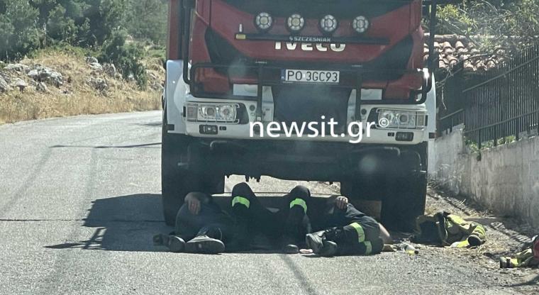 Κάποιοι Πολωνοί πυροσβέστες, αποκαμωμένοι από τη μάχη με την πύρινη λαίλαπα, ξέκλεψαν λίγο χρόνο για να ξεκουραστούν κατά γης, στον ίσκιο μπροστά από το πυροσβεστικό τους όχημα.