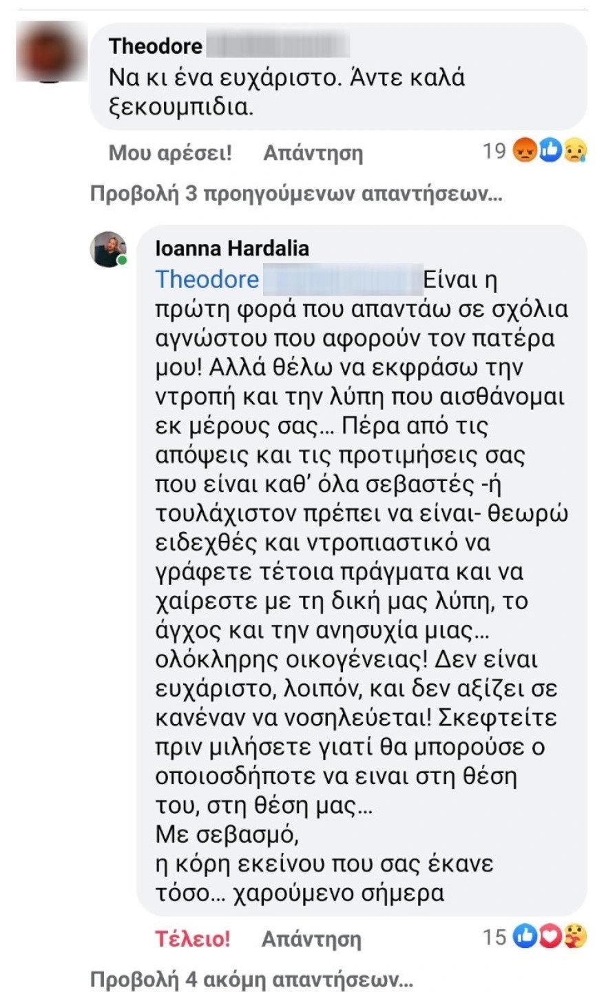 «Είναι η πρώτη φορά που απαντάω σε σχόλια αγνώστου που αφορούν τον πατέρα μου. Αλλά θέλω να εκφράσω την ντροπή και τη λύπη που αισθάνομαι εκ μέρους σας. Πέρα από τις απόψεις και τις προτιμήσεις σας, που είναι καθ'όλα σεβαστές, η τουλάχιστον πρέπει να είναι, θεωρώ ειδεχθές και ντροπιστικό να γράφετε τέτοια πράγματα και να χαίρεστε με τη δική μας λύπη, το άγχος και την ανησυχία μιας ολόκληρης οικογένειας. Δεν είναι ευχάριστο λοιπόν και δεν αξίζει σε κανέναν να νοσηλεύεται. Σκεφτείτε πριν μιλήσετε γιατί θα μπορούσε ο οποιοσδήποτε να είναι στη θέση του, στη θέση μας. Με σεβασμό η κόρη εκείνου που σας έκανε τόσο χαρούμενους σήμερα».