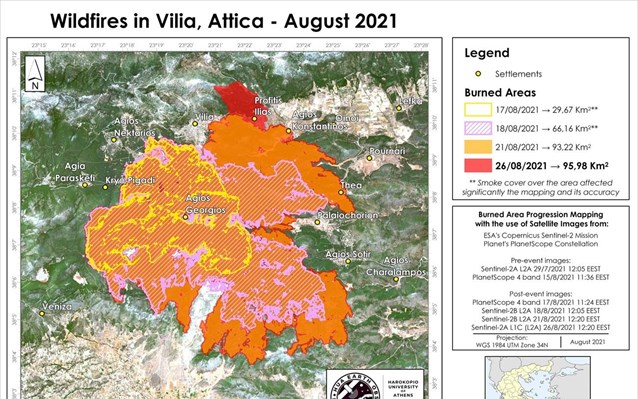 Με τη χρήση δορυφορικών εικόνων Sentinel-2, πραγματοποιήθηκε η χαρτογράφηση της σφοδρότητας πυρκαγιάς, όπως και της καμένης έκτασης με εικόνες πριν (29/7/2021 Sentinel-2A L2A) και μετά (26/8/2021 Sentinel-2A L1C - μετατράπηκε σε L2A) την πυρκαγιά. Έγινε εφαρμογή διαφορικού NBR και έπειτα εξαγωγή του RBR.