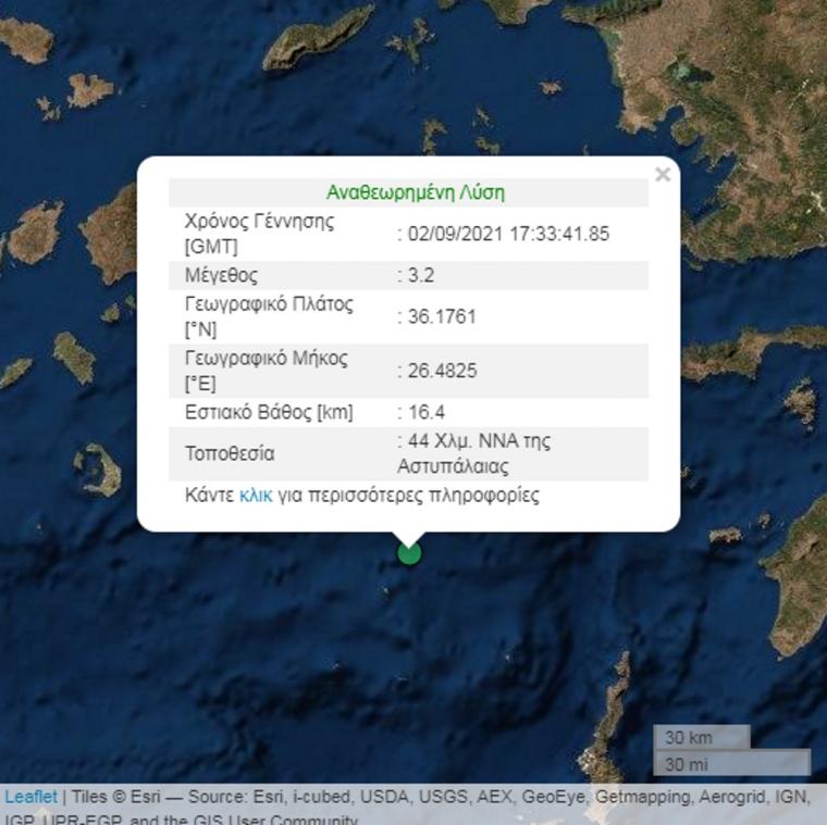 Ο σεισμός έχει μέγεθος 3,2 βαθμών της κλίμακας Ρίχτερ και επίκεντρο 44 χιλιόμετρα νότια – νοτιοανατολικά της Αστυπάλαιας στη θαλάσσια περιοχή.