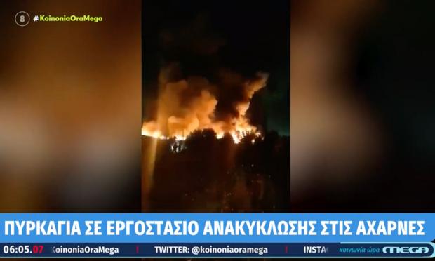 Η φωτιά έκαιγε όλο το βράδυ. Δεν είναι γνωστό ακόμη πως ξεκίνησε η πυρκαγιά στο εργοστάσιο ανακύκλωσης, που βρίσκεται στην οδό Λουτρού στο δήμο Αχαρνών.