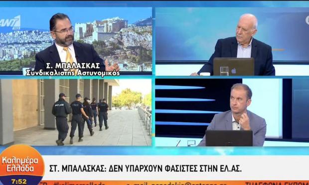Δεν υπάρχουν «ορδές φασιστών» στα Σώματα Ασφαλείας, τόνισε ο Σταύρος Μπαλάσκας, ερωτηθείς για το αν υπάρχουν ακροδεξιοί θύλακες στους κόλπους της Αστυνομίας. «Κάποιοι άνθρωποι που ιδεολογικά πιστεύουν αυτές τις επικίνδυνες ανοησίες, ενδεχομένως να υπάρχουν… Αλλά όχι σε τέτοιο βαθμό που να δημιουργούν εσωτερικό πρόβλημα» είπε χαρακτηριστικά.