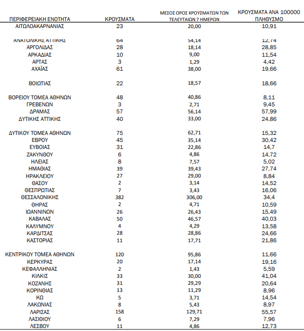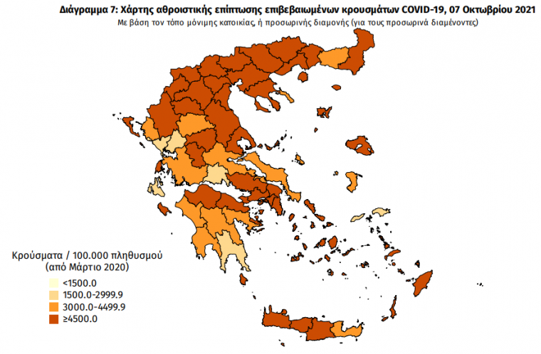 Ο χάρτης αποτυπώνει τη γεωγραφική κατανομή των συνολικών κρουσμάτων COVID-19 (από την αρχή της επιδημίας) ανά Περιφερειακή Ενότητα της χώρας, με βάση την δηλωθείσα διεύθυνση μόνιμης κατοικίας του ασθενούς, ή τη διεύθυνση προσωρινής διαμονής για τους τουρίστες και άλλους προσωρινά διαμένοντες στην Ελλάδα. Συμπεριλαμβάνονται τόσο κρούσματα με ιστορικό ταξιδίου (“εισαγόμενα”) όσο και κρούσματα με πιθανή εγχώρια μετάδοση.