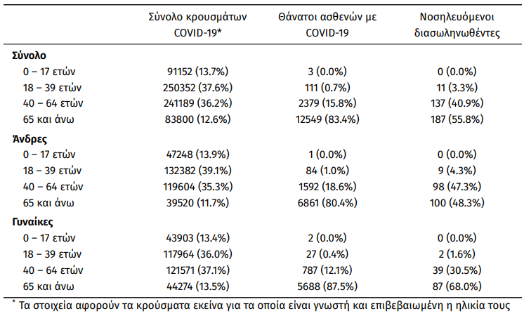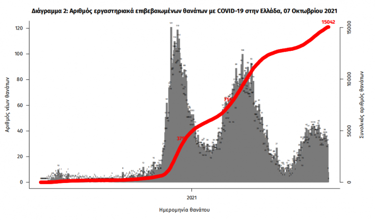 Οι νέοι θάνατοι ασθενών με COVID-19 είναι 30, ενώ από την έναρξη της επιδημίας έχουν καταγραφεί συνολικά 15.042 θάνατοι. Το 95.4% είχε υποκείμενο νόσημα ή/και ηλικία 70 ετών και άνω.