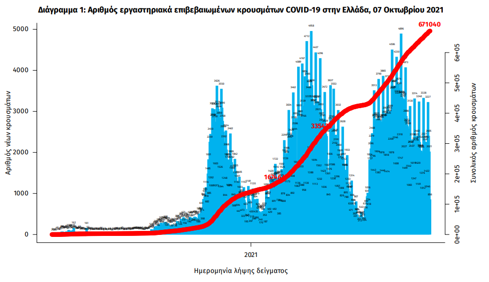 Τα νέα εργαστηριακά επιβεβαιωμένα κρούσματα της νόσου που καταγράφηκαν τις τελευταίες 24 ώρες είναι 2.249, εκ των οποίων 6 εντοπίστηκαν κατόπιν ελέγχων στις πύλες εισόδου της χώρας. Ο συνολικός αριθμός των κρουσμάτων ανέρχεται σε 671.040 (ημερήσια μεταβολή +0.3%), εκ των οποίων 50.9% άνδρες.