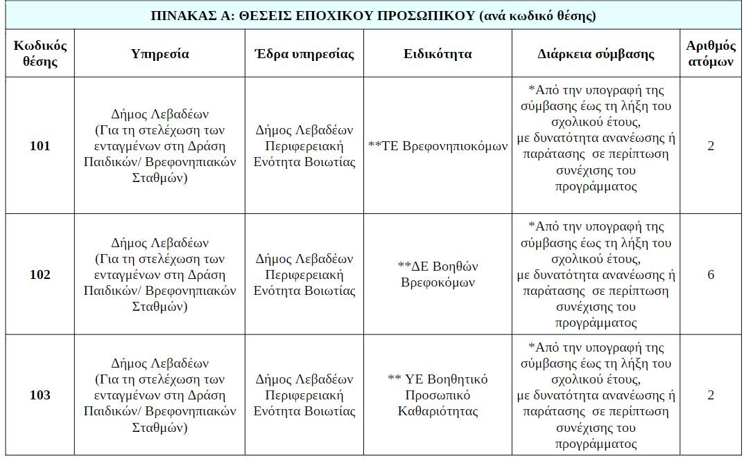Ο Δήμος Λεβαδέων ανακοινώνει την πρόσληψη, με σύμβαση εργασίας ιδιωτικού δικαίου ορισμένου χρόνου, συνολικά δέκα ατόμων για την υλοποίηση της δράσης «Εναρμόνιση Οικογενειακής και Επαγγελματικής Ζωής» (περίοδος 2021-2022).