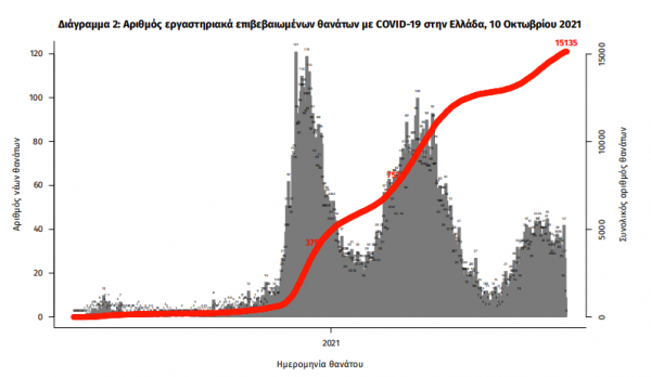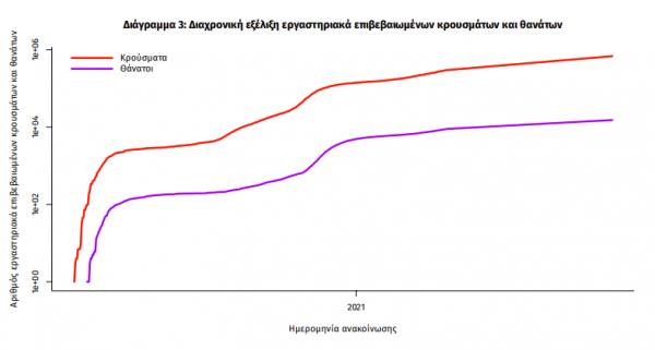Η διαχρονική εξέλιξη των συνολικών κρουσμάτων και συνολικού αριθμού των θανάτων ασθενών COVID-19 παρουσιάζεται στο ακόλουθο διάγραμμα.