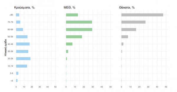 Οι εισαγωγές νέων ασθενών Covid-19 στα νοσοκομεία της επικράτειας είναι 206 (ημερήσια μεταβολή +15.73%). Ο μέσος όρος εισαγωγών του επταημέρου είναι 179 ασθενείς. Η διάμεση ηλικία των κρουσμάτων είναι 39 έτη (εύρος 0.2 έως 106 έτη), ενώ η διάμεση ηλικία των θανόντων είναι 78 έτη (εύρος 0.2 έως 106 έτη).