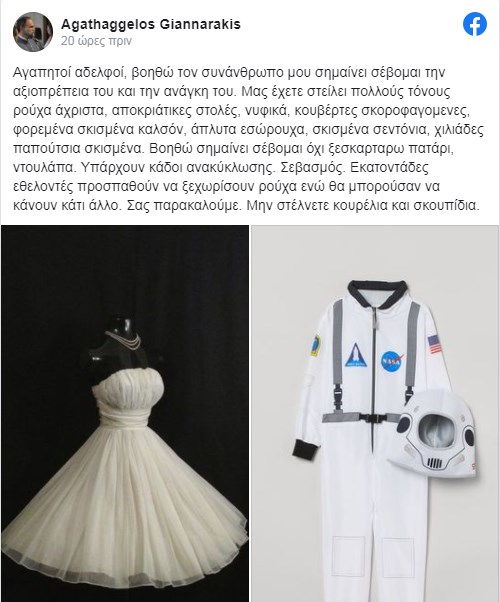 "Μας έχετε στείλει πολλούς τόνους ρούχα άχριστα, αποκριάτικες στολές, νυφικά, κουβέρτες σκοροφαγομενες, φορεμένα σκισμένα καλσόν, άπλυτα εσώρουχα, σκισμένα σεντόνια, χιλιάδες παπούτσια σκισμένα. Βοηθώ σημαίνει σέβομαι όχι ξεσκαρταρω πατάρι, ντουλάπα. Υπάρχουν κάδοι ανακύκλωσης. Σεβασμός. Εκατοντάδες εθελοντές προσπαθούν να ξεχωρίσουν ρούχα ενώ θα μπορούσαν να κάνουν κάτι άλλο. Σας παρακαλούμε. Μην στέλνετε κουρέλια και σκουπίδια" αναφέρει χαρακτηριστικά.