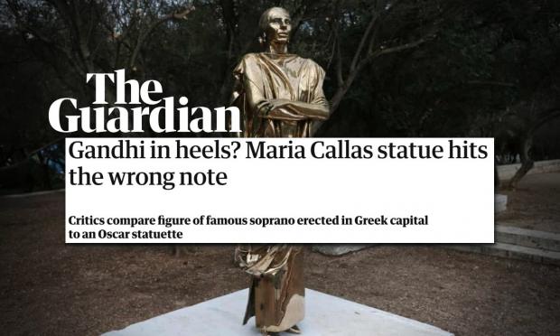 «Το έργο ύψους 1,8 μέτρων, που δημιουργήθηκε προς τιμήν της σοπράνο από θαυμαστές που θεωρούν την Κάλλας ως ένα από τα πιο υποτιμημένα περιουσιακά στοιχεία της χώρας, έχει επικριθεί ότι είναι κιτς, ακατάλληλο και, ακόμη χειρότερα, δεν μοιάζει με το είδωλό της.