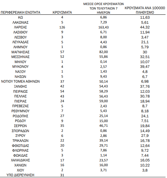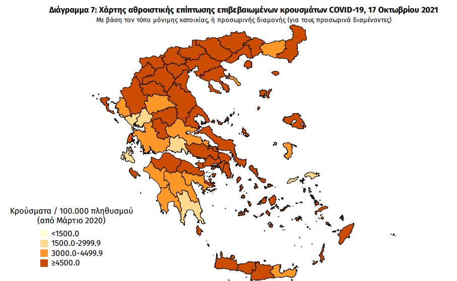 Ο χάρτης αποτυπώνει τη γεωγραφική κατανομή των συνολικών κρουσμάτων COVID-19 (από την αρχή της επιδημίας) ανά Περιφερειακή Ενότητα της χώρας, με βάση την δηλωθείσα διεύθυνση μόνιμης κατοικίας του ασθενούς, ή τη διεύθυνση προσωρινής διαμονής για τους τουρίστες και άλλους προσωρινά διαμένοντες στην Ελλάδα. Συμπεριλαμβάνονται τόσο κρούσματα με ιστορικό ταξιδίου (“εισαγόμενα”) όσο και κρούσματα με πιθανή εγχώρια μετάδοση.