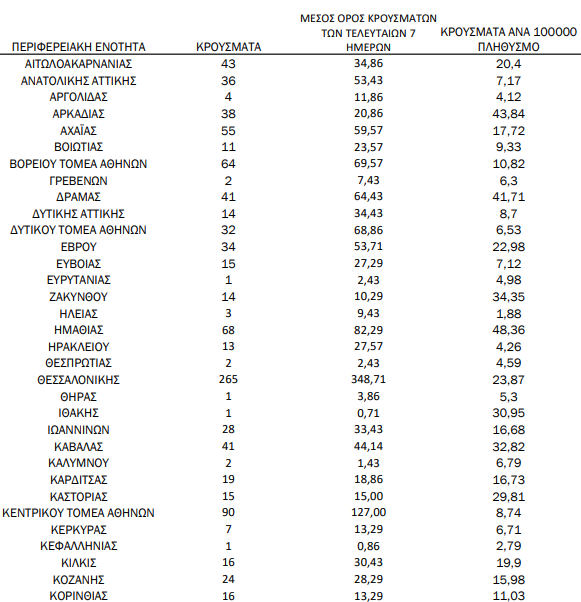 Με βάση τα επιβεβαιωμένα κρούσματα των τελευταίων 7 ημερών, 114 θεωρούνται σχετιζόμενα με ταξίδι από το εξωτερικό και 2.221 είναι σχετιζόμενα με ήδη γνωστό κρούσμα.