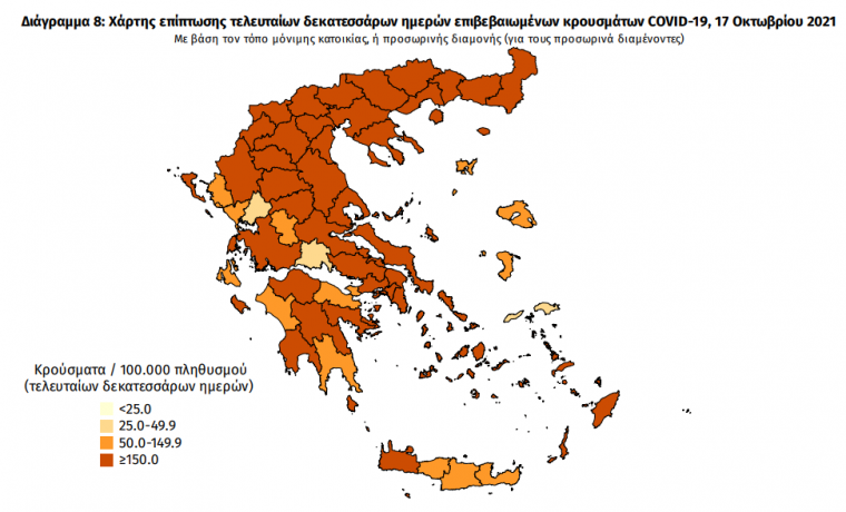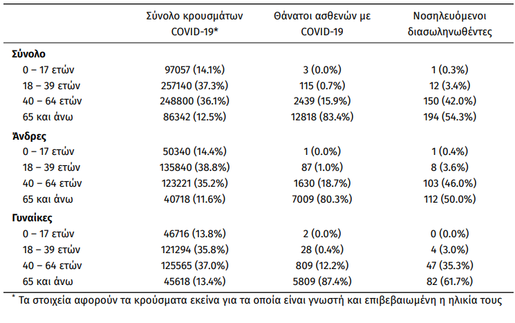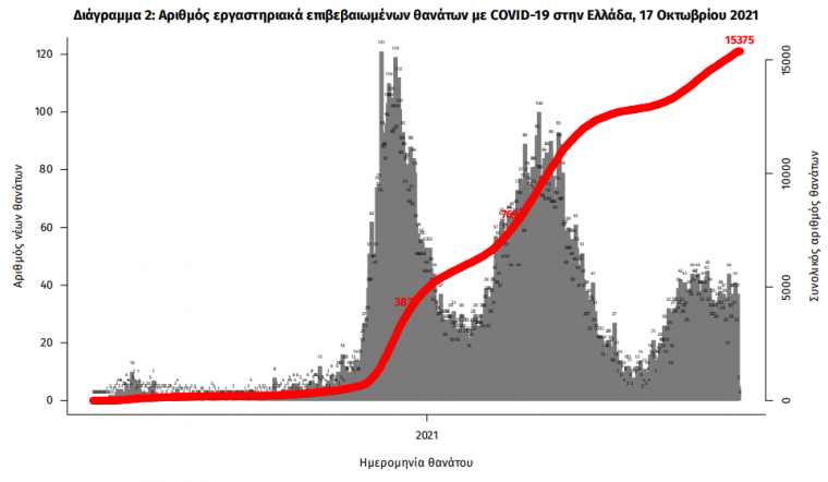 Οι νέοι θάνατοι ασθενών με COVID-19 είναι 27, ενώ από την έναρξη της επιδημίας έχουν καταγραφεί συνολικά 15.375 θάνατοι. Το 95.4% είχε υποκείμενο νόσημα ή/και ηλικία 70 ετών και άνω.
