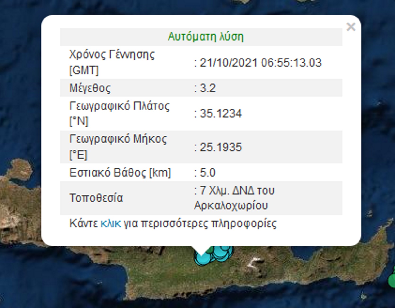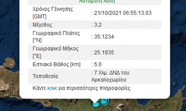 Ο σεισμός παρά το μικρό του μέγεθος, ταρακούνησε τόσο το πολύπαθο Αρκαλοχώρι όσο και το Ηράκλειο της Κρήτης. Η δόνηση των 3,2 Ρίχτερ είχε εστιακό βάθος μόλις 5 χιλιομέτρων και επίκεντρο 7 χιλιόμετρα νοτιοδυτικά του Αρκαλοχωρίου.