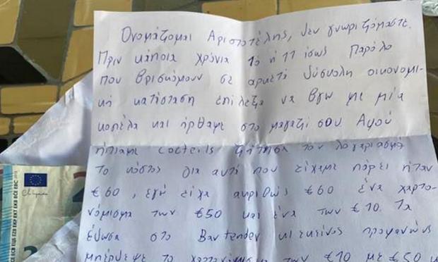 Η παρακάτω επιστολή, μαζί με 40 ευρώ, έφτασε στα χέρια ενός ιδιοκτήτη μπαρ στα Χανιά. Στο γράμμα, ο Αριστοτέλης Τ. παραδέχεται ένα λάθος που έπραξε πριν πολλά χρόνια και ζητάει συγγνώμη. Θέλει όπως λέει να επανορθώνει το λάθος του, πληρώνοντας στο ακέραιο το όφελος που είχε.