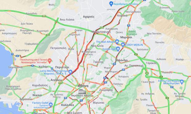 Κίνηση, λόγω και της ώρας, υπάρχει σε όλες σχεδόν τις κεντρικές οδούς του Λεκανοπεδίου, με τον χάρτη να είναι κόκκινος σε πολλά σημεία.