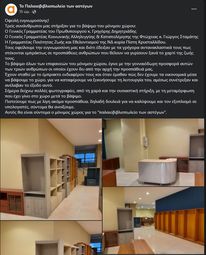 «Έχουν σταθεί με το έμπρακτο ενδιαφέρον τους και όταν έμαθαν πώς δεν έχουμε τα οικονομικά μέσα να βάψουμε για να καταφέρουμε να ξεκινήσουμε την λειτουργία του, αμέσως συνέτρεξαν και ανέλαβαν το έξοδο αυτό. Σήμερα δείχνω πολλές, από τη χαρά και την ουσιαστική στήριξη, φωτογραφίες με τη μεταμόρφωση που έχει γίνει στον χώρο μετά το βάψιμο. Πιστεύουμε πως με λίγη ακόμα προσπάθεια δηλαδή δουλειά για να καλύψουμε και τον εξοπλισμό σε υπολογιστές σύντομα θα ανοίξουμε. Αυτός θα είναι σύντομα ο μόνιμος χώρος για το “παλαιοβιβλιοπωλείο των αστέγων”», καταλήγει στο μήνυμά του.