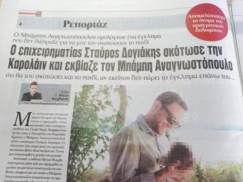 Το έντυπο αναφέρει, δηλαδή, ότι ο Σταύρος Δογιάκης, για τον οποίο έχει αποκαλυφθεί τι είδους σχέση είχε με τον Μπάμπη Αναγνωστόπουλο, απείλησε να σκοτώσει τη μικρή Λυδία, αν εκείνος δεν έπαιρνε το έγκλημα πάνω του. Δεν είναι σαφές, βέβαια, γιατί ήθελε να σκοτώσει την Καρολάιν, με βάση το δημοσίευμα, με τις Αρχές να είναι σίγουρο πως θα εξετάσουν το πώς μπορεί να προκύπτει μια τέτοια πληροφορία.