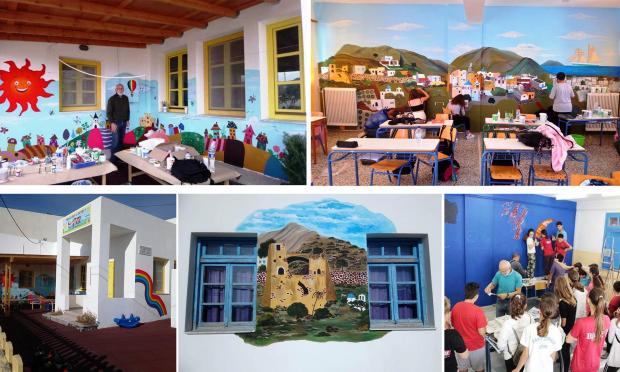 Η παρουσία του στο νησί βοήθησε ώστε να ξεκινήσει και να ολοκληρώσει και το ζωγραφικό διάκοσμο του νηπιαγωγείου Ακρωτηρίου πάντα με τη συμμετοχή των παιδιών, εθελοντών γονέων και εκπαιδευτικών που καθοδηγούσε και επέβλεπε.