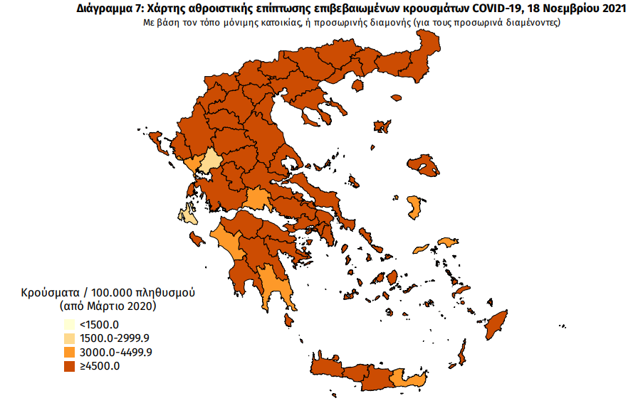 Ο χάρτης αποτυπώνει τη γεωγραφική κατανομή των συνολικών κρουσμάτων COVID-19 (από την αρχή της επιδημίας) ανά Περιφερειακή Ενότητα της χώρας, με βάση την δηλωθείσα διεύθυνση μόνιμης κατοικίας του ασθενούς, ή τη διεύθυνση προσωρινής διαμονής για τους τουρίστες και άλλους προσωρινά διαμένοντες στην Ελλάδα. Συμπεριλαμβάνονται τόσο κρούσματα με ιστορικό ταξιδίου (“εισαγόμενα”) όσο και κρούσματα με πιθανή εγχώρια μετάδοση.
