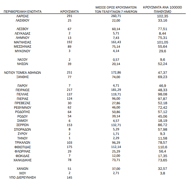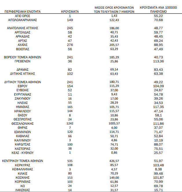 Με βάση τα επιβεβαιωμένα κρούσματα των τελευταίων 7 ημερών, 103 θεωρούνται σχετιζόμενα με ταξίδι από το εξωτερικό και 2.879 είναι σχετιζόμενα με ήδη γνωστό κρούσμα.