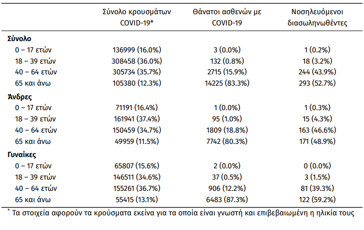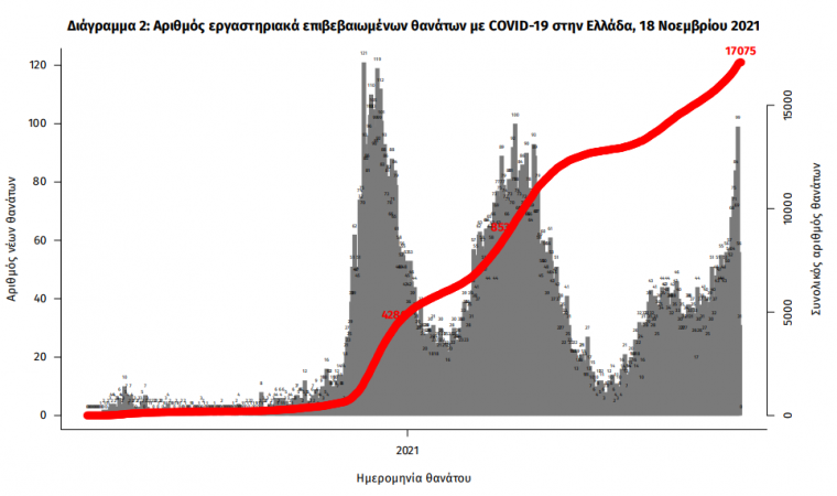Οι νέοι θάνατοι ασθενών με COVID-19 είναι 63, ενώ από την έναρξη της επιδημίας έχουν καταγραφεί συνολικά 17.075 θάνατοι. Το 95.3% είχε υποκείμενο νόσημα ή/και ηλικία 70 ετών και άνω.