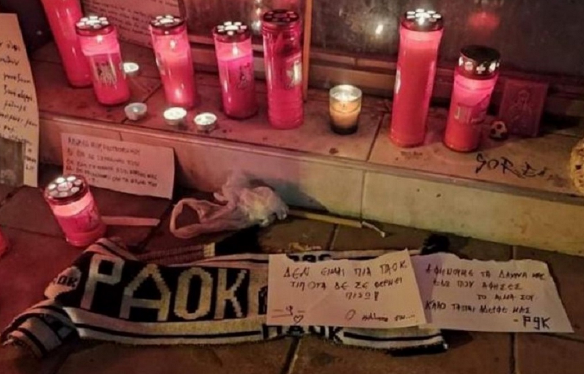Πάνω σε ένα κασκόλ του ΠΑΟΚ, έχει γράψει σε χαρτί λίγες λέξεις που όμως περιγράφουν απόλυτα τα συναισθήματά του για όσα συνέβησαν. «Δεν είμαι πια ΠΑΟΚ. Τίποτα δεν σε φέρνει πίσω. Ο κολλητός σου», γράφει στο ένα χαρτί, ενώ ακριβώς δίπλα έχει αφήσει ένα άλλο που αναφέρει: «Αφήνουμε τα δάκρυα μας εδώ που άφησες το αίμα σου. Καλό ταξίδι αδερφέ μας». Δείτε την εικόνα του voria.gr…