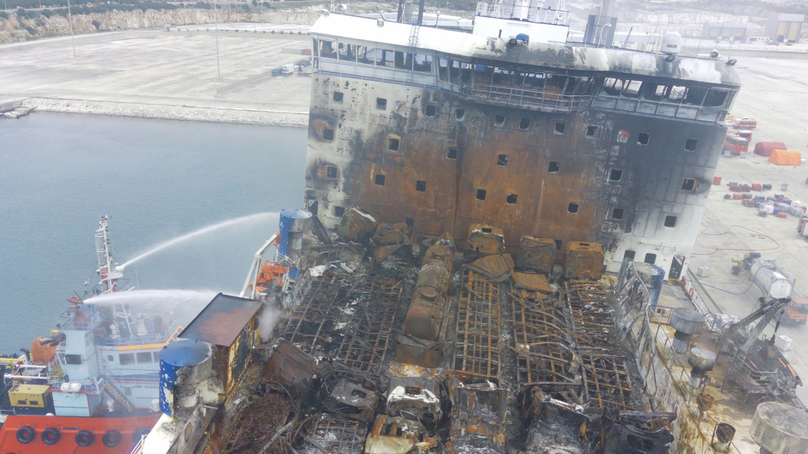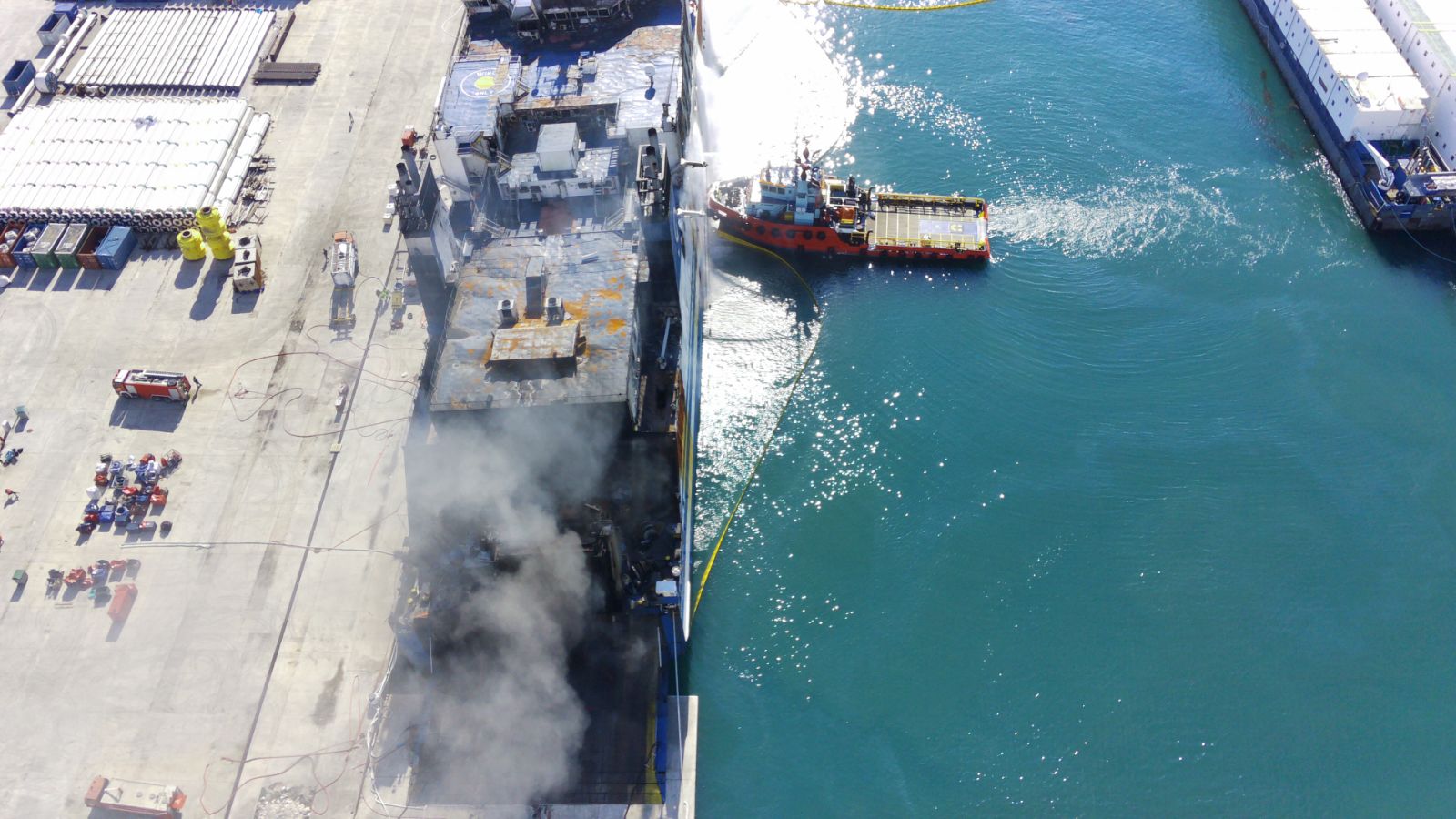 Από τον προβλήτα, ρομποτικές αντλίες εκτοξεύουν νερό πλευρικά του καραβιού για να μειωθεί η θερμοκρασία, ενώ από την θάλασσα επιχειρούν το ρυμουλκό Ντολφιν 1 και το πλωτό σκάφος της πυροσβεστικής.