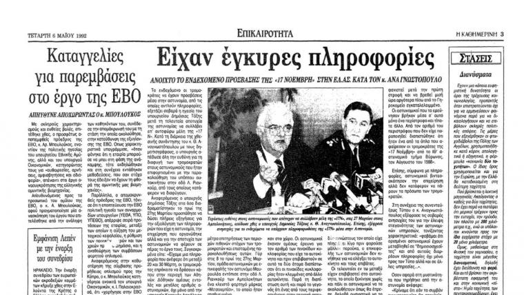 «Το ενδεχόμενο οι τρομοκράτες να έχουν προσβάσεις μέσα στην αστυνομία, από τις οποίες αντλούν πληροφορίες, εξετάζει σοβαρά η ηγεσία του υπουργείου Δημόσιας Τάξης μετά την τελευταία αποτυχία της αστυνομίας να συλλάβει επ’ αυτοφώρω μέλη της “17 Ν”. Κατά τη διάρκεια της χθεσινής συνάντησης του κ. Θ. Αναγνωστόπουλου με τους δημοσιογράφους, ο υπουργός απέδωσε όλη την ευθύνη για τη διαφυγή των τρομοκρατών στους αστυνομικούς που ήταν επιφορτισμένοι με την παρακολούθηση του υπόπτου αυτοκινήτου στην οδό Λ. Ριανκούρ, από τους οποίους κατάφεραν να διαφύγουν…» έγραφε τότε η «Καθημερινή».