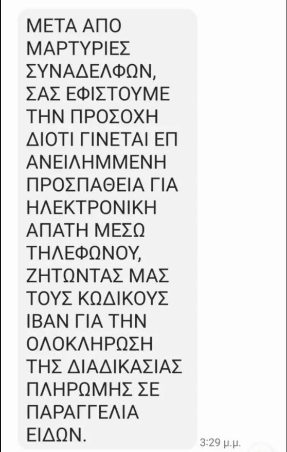 Μόλις πριν λίγες ώρες, φαρμακείο στα Χανιά – σημειώνει το zarpanews.gr – δέχτηκε τέτοια κλήση από κάποιον που συστήθηκε ως αστυνομικός και παρήγγειλε διάφορα είδη, αξίας άνω των 200 ευρώ και όταν τα πράγματα ήταν έτοιμα, ο φαρμακοποιός ειδοποίησε τον «πελάτη» ότι μπορεί να τα παραλάβει. Τότε εκείνος του ζήτησε έναν αριθμό λογαριασμού για να του βάλει εκεί τα χρήματα…