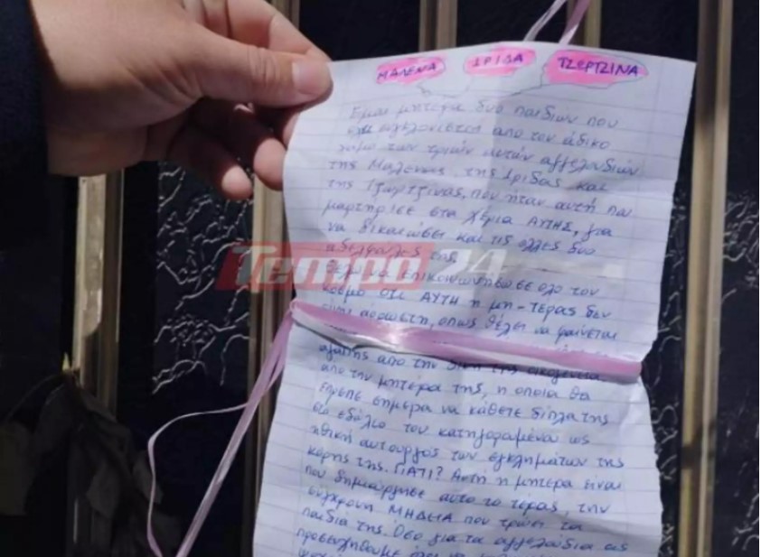 Το μήνυμά της, γραμμένο σε χαρτί, μαζί με δύο μπαλόνια το άφησε στην πόρτα του σπιτιού της οικογένειας. Τα όσα αναφέρει, είναι αδύνατον να περάσουν απαρατήρητα. «Είμαι μητέρα δύο παιδιών που έχει συγκλονιστεί από τον χαμό των τριών αυτών αγγελουδιών. Της Μαλένας, της Ίριδας και της Τζωρτζίνας, που ήταν αυτή που μαρτύρησε στα χέρια αυτής, για να δικαιώσει και τις άλλες δύο αδερφούλες της» διαβάζουμε στις πάνω γραμμές του μηνύματος.