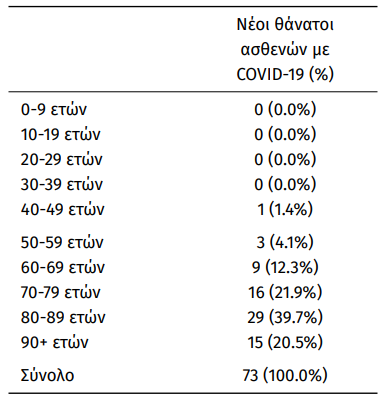 Οι νέοι θάνατοι ασθενών με COVID-19 είναι 73, ενώ από την έναρξη της επιδημίας έχουν καταγραφεί συνολικά 27.892 θάνατοι. Το 95.4% είχε υποκείμενο νόσημα ή/και ηλικία 70 ετών και άνω.