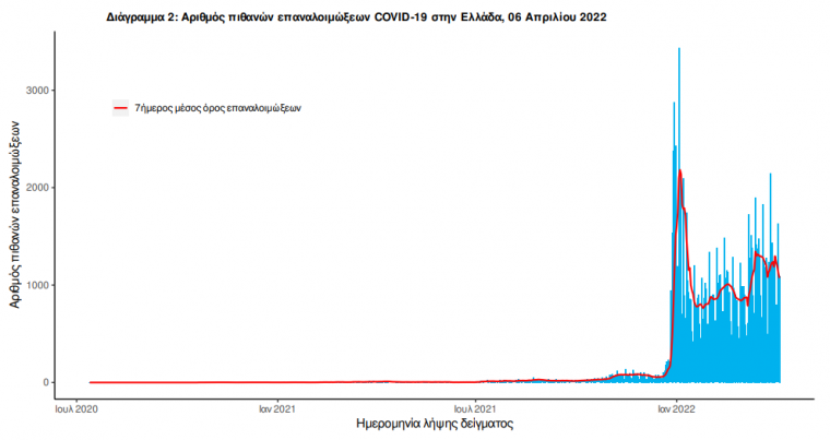 Ο αριθμός πιθανών νέων επαναλοιμώξεων που καταγράφηκαν τις τελευταίες 24 ώρες ήταν 1.467 ενώ από την αρχή της πανδημίας SARS-CoV-2 ο συνολικός αριθμός εκτιμάται σε 118.070(3.6% του συνολικού αριθμού των θετικών αποτελεσμάτων).